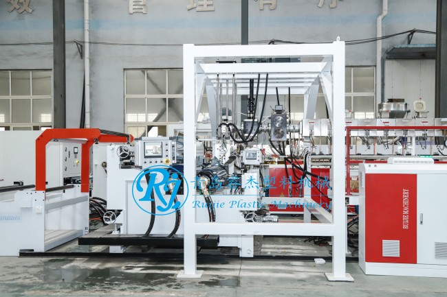 本機是通過對PET瓶片破碎料和原料干燥結晶后進入生產線融化后擠出片材。PET–干燥結晶—平雙擠出機–模具—三輥壓延機—冷卻托架–涂硅油—牽引機—儲帶機–切邊裁斷機–收卷機–成品包裝入庫。