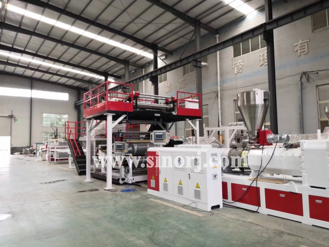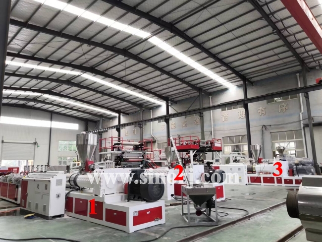 等待發貨的三套設備:PVC木塑中空門板設備,仿大理石設備,SPC地板設備。